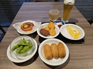 金沢 ラウンジタイム 17時スタートで、30位居ましたが、貸し切り状態でした。今日も、いなり寿司とチキンナゲット・ポテト・枝豆とチーズPizzaと初のハンバーグをプレモルと梅酒炭酸水割で頂きました!