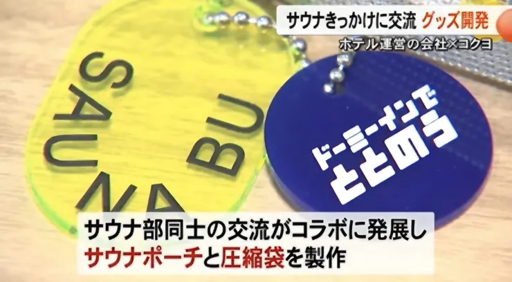 二つの会社の『サウナ部』同士の交流がコラボに発展し、今回は、サウナポーチと旅行で使える圧縮袋を製作しました。