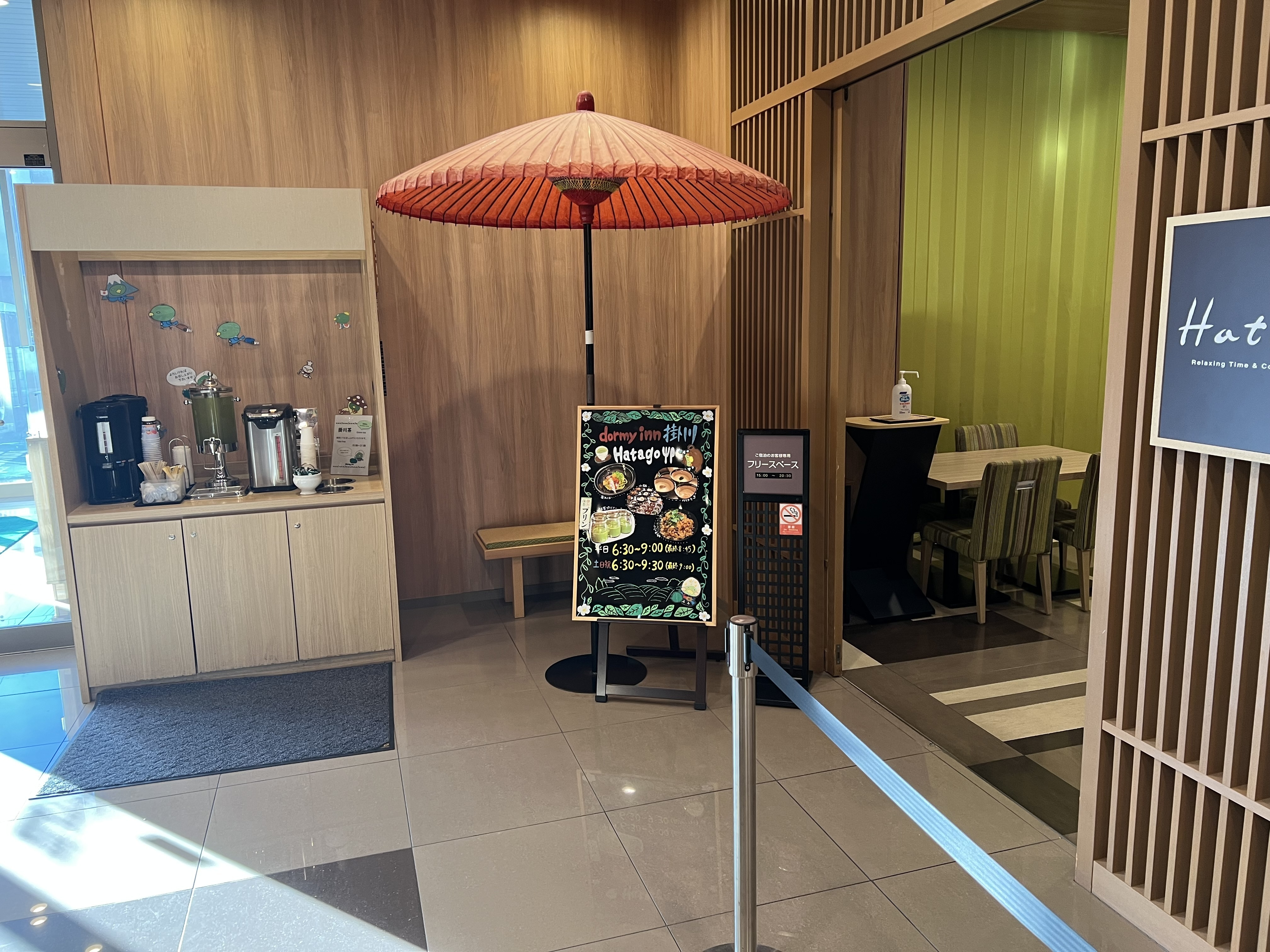 フロントへ足を踏み入れると、ドーミーインEXPRESSのロゴと共に、茶釜と赤い傘が目を引く茶室の設え。0歳の息子は物珍しそうに上向いて嬉しそうな顔と声を出してました!ウェルカムドリンクにはコーヒーだけでなく、流石はお茶処・静岡、掛川茶のサービス。レストランのサーバーからも掛川茶がいただける徹底ぶりが嬉しい。そしてスタッフさんも優しくもうこの時点でハッピー!