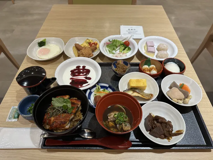 朝食は、ひつまぶし、どて煮、豆ちくわや のんほい牛乳など愛知ならではのご当地料理が多く美味しかったです😋