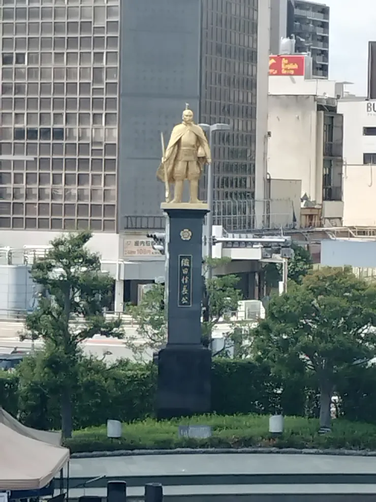 駅前広場では、織田信長がお出迎え!