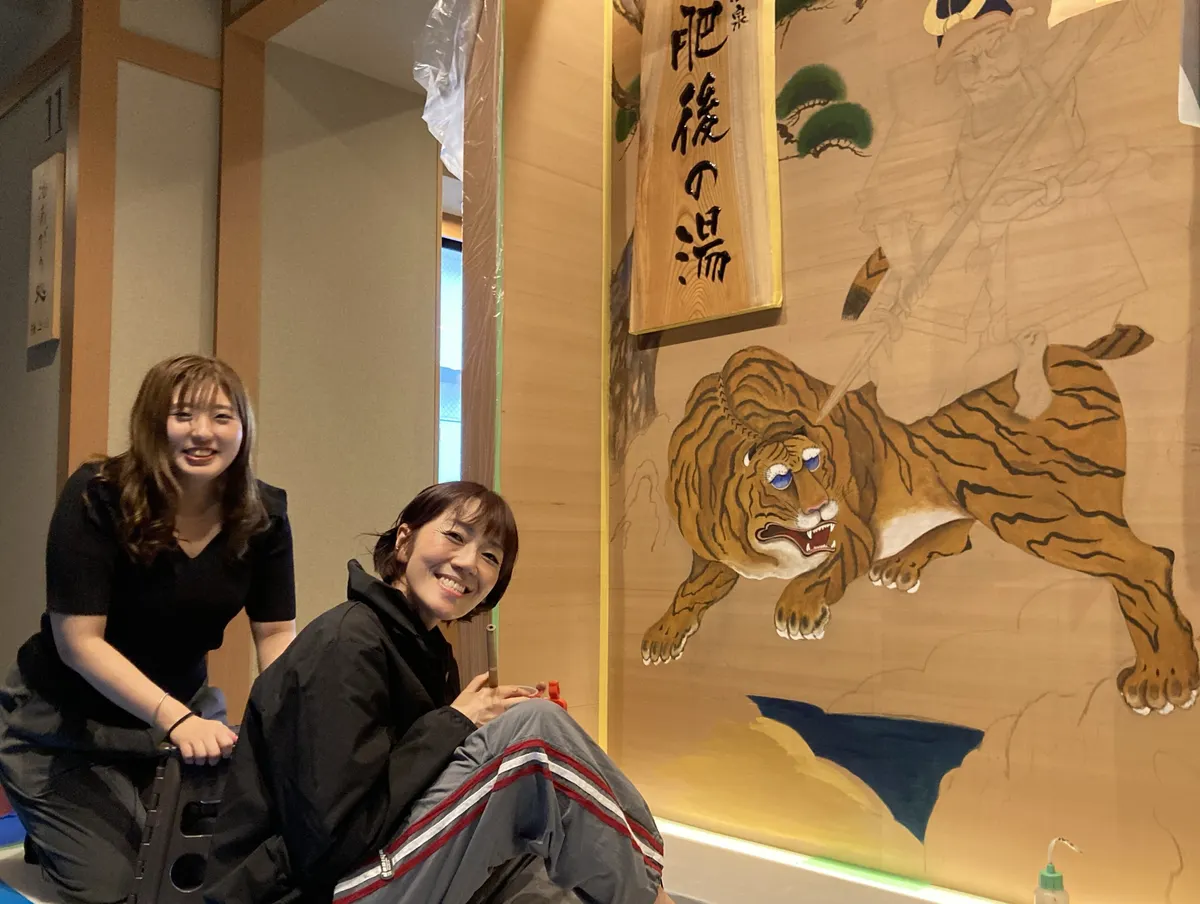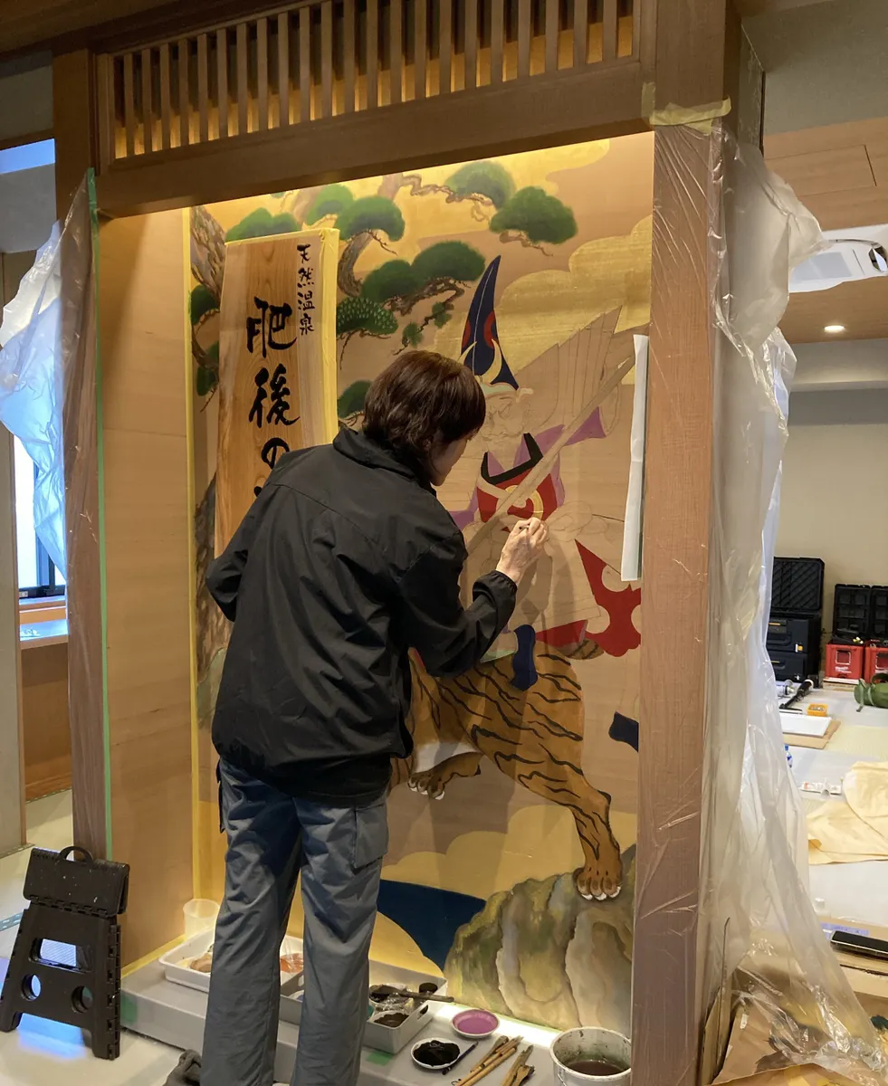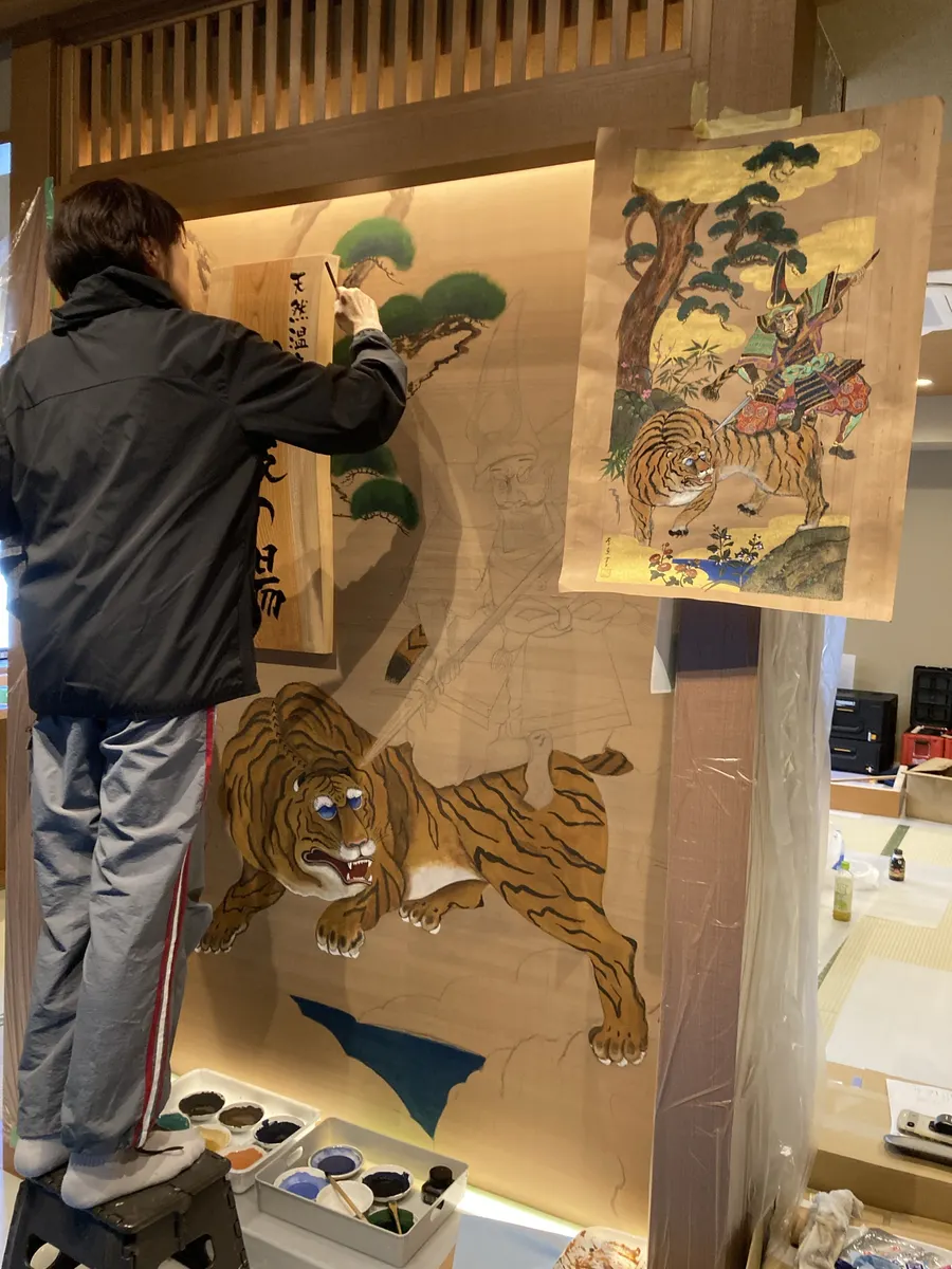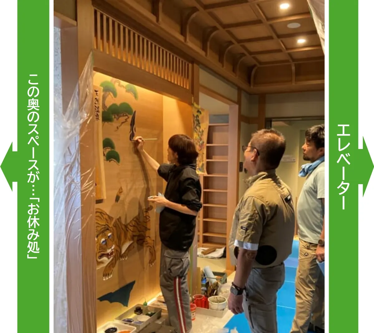 今年OPENしたドーミーイン敦賀やドーミーインEXPRESS出雲の国 雲南をはじめ、これまで当社ホテルの各所に素敵な絵画で協力してくださっている絵師の李惠(りけい)※さまの制作ナマ現場に立ち会える!と聞きつけ、大工さんチームからのお誘いに「ぜひぜひ!」と2つ返事でお邪魔したのです。