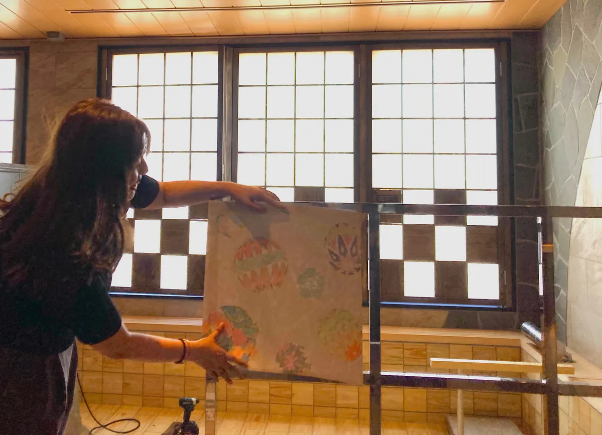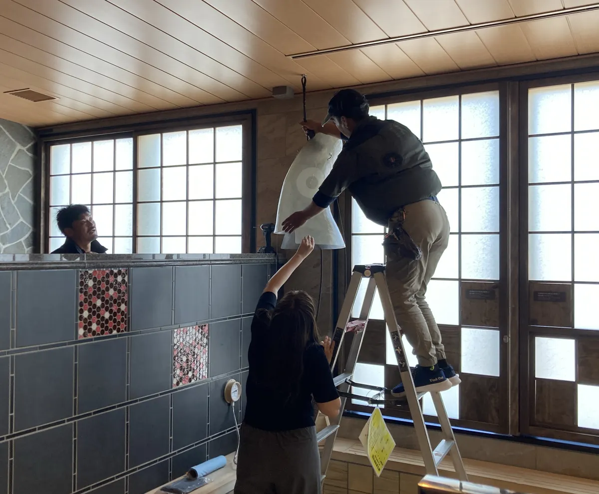 「これ、今から吊るすので、大浴場へどうぞ!」と(株)綜合デザインの福田さん。