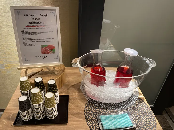 入り口にはお食事前のざくろ酢ドリンクが。なんでも試してみたがりなので飲んでみるととても美味しい!その間案内のスタッフさん待っていてくださいました。