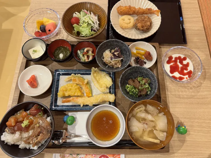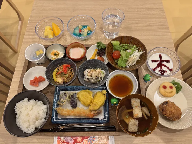 ご当地メニューは赤茄子のたたきやあか牛入りメンチ、いきなり団子など。個人的には辛子れんこんの天ぷらが美味しかったなぁ。もちろん揚げたてサクサク、でもちゃんと辛味が残ってて優しく鼻にツーンとくる感じ。2泊しましたがこの天ぷらは沢山頂きました🙏