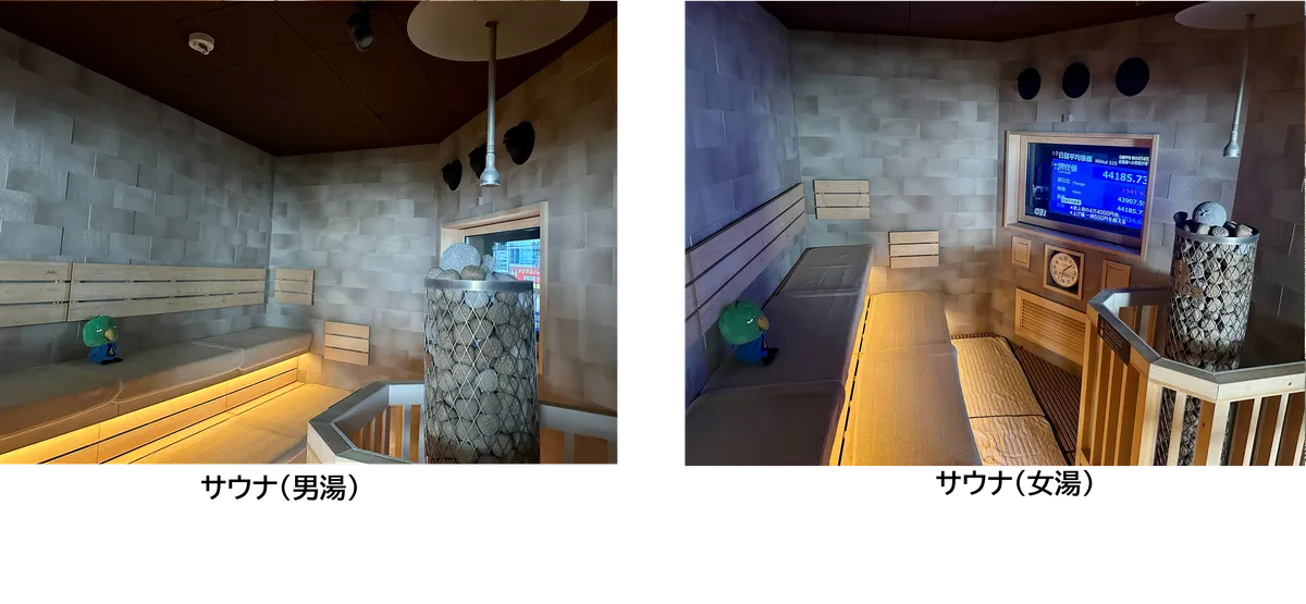 サウナ室は男湯3段、女湯2段の広々としたテレビ付きサウナです。