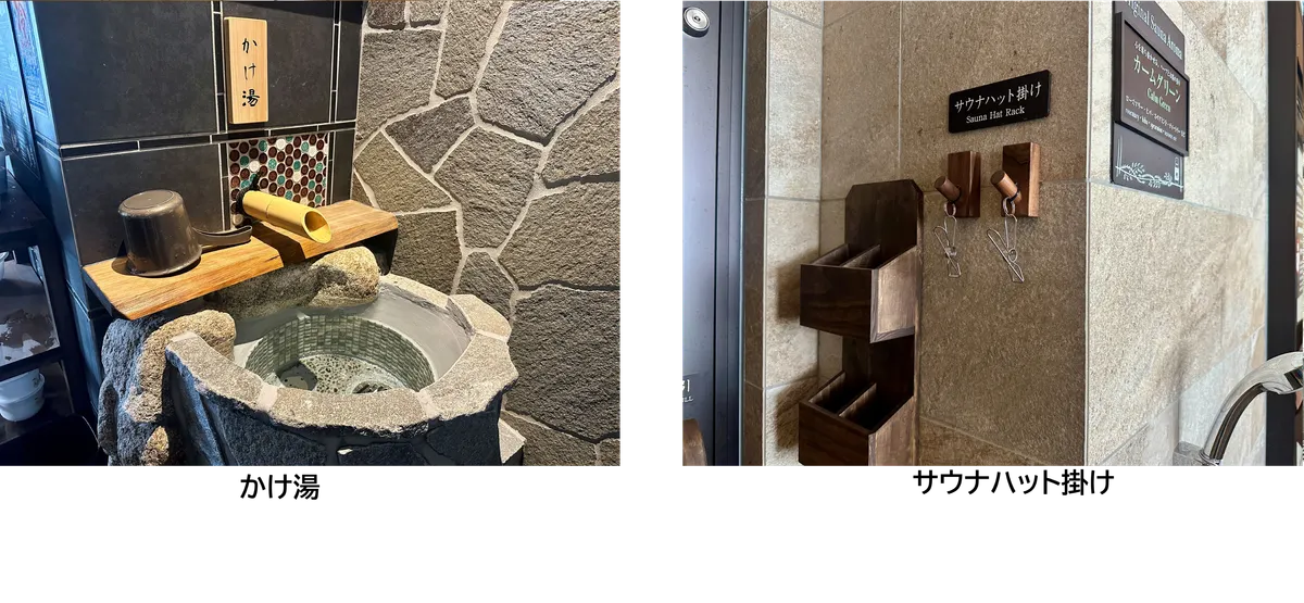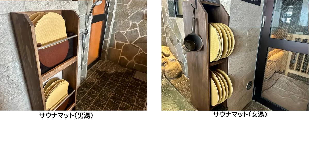 男女共に入口にはかけ湯が、サウナ入口にはサウナハット掛けが、サウナマットも設置されています。