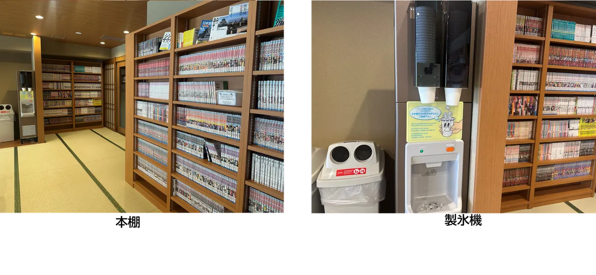 乳酸菌飲料を飲みながら、「シン・サウナ」が置かれている本棚を眺めて休憩。製氷機もこちらのエリアにあります。奥にはマッサージスペースも。
