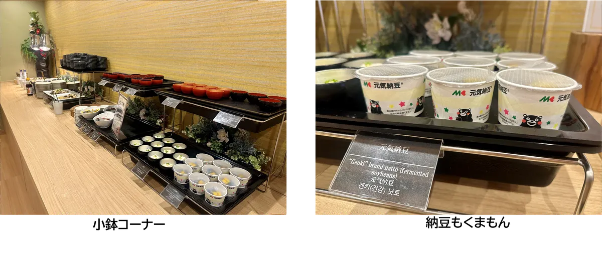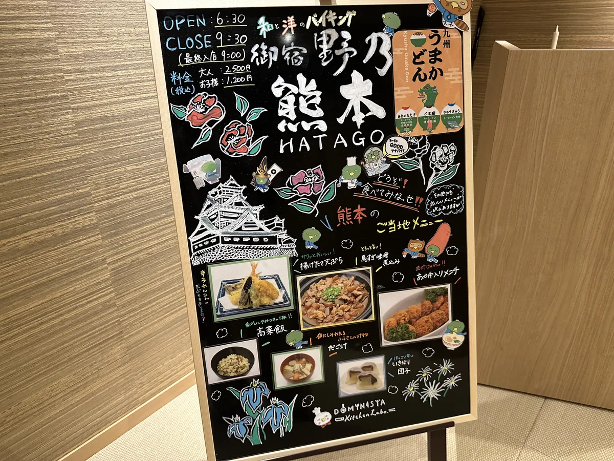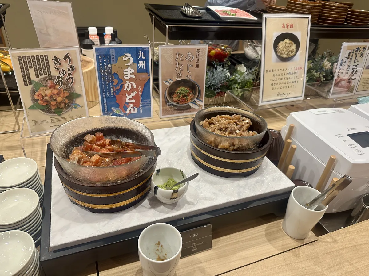 部屋番号を伝えて席を取り、熊本のうまかもんが揃うビュッフェ台を見てさらに目が覚めます!