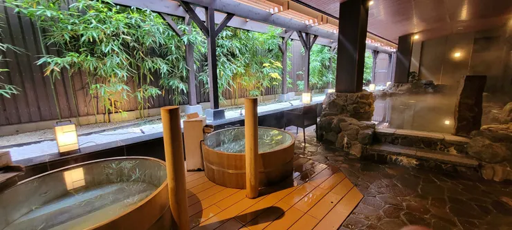 檜内風呂、露天岩風呂、樽風呂、寝湯、高温サウナに岩盤浴まであります!