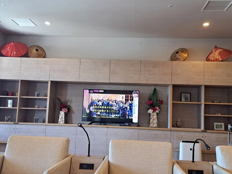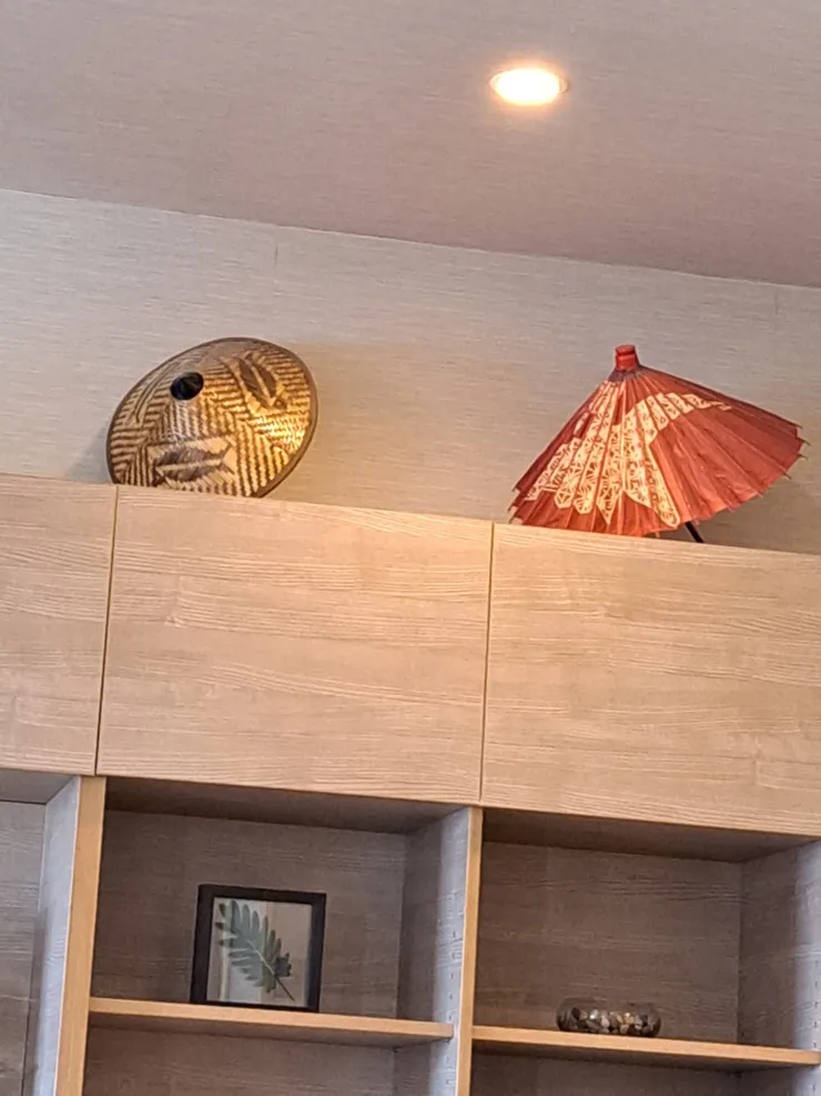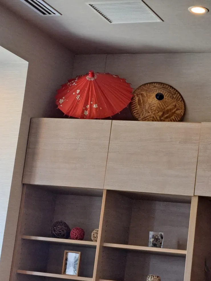 ここに ほらほら~(σ・∀・)σ テレビの両脇に和傘がありますよ。