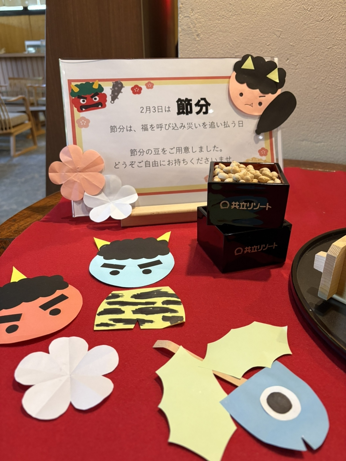 トップ > ドミフォト館 > FAN×FUN > ♪鬼は~外!福は~内!(/>ω<)/□。・゜。・.゜ あきちーいんこ 2026/02/03 16:01 ♪鬼は~外!福は~内!(/>ω<)/□。・゜。・.゜ 本日は節分。ロビーフロントで節分の豆を提供中です! ぜひ豆(魔目もしくは魔滅)を食べて邪気を退けましょう! 節分には年の数+1つの豆を食べる習慣があります。食べる際にはお茶と一緒にお召し上がりください。(間違っても一気とかされないよう(;´・ω・`)) 壁|* -ノω-)コッソリ(年の数の豆に熱いお茶を注いで『福茶』にして飲むと、年の数だけ食べるのと同じ御利益があるといわれているそうですよ・・・) □╰( ^o^)╮-=ニ=゚。º◦👹 水の音 いいね 共有する 共有する X facebook LINE リンクをコピー 水の音 詳細を見る コメントする 3 件の返信 (新着順) ミュートしたユーザーの投稿です。 投稿を表示 くるみいんこ 事務局 2026/02/04 12:08 あきちーいんこ あきちーいんこさん、ご投稿ありがとうございます!!✨ 鬼の飾り👹かわいすぎます!!水の音の皆さんで作られたのでしょうか?✂️ これからも季節の色々な投稿とても楽しみにしております。. o(≧▽≦)o .。. いいね 返信する ミュートしたユーザーの投稿です。 投稿を表示 あおりんご456 2026/02/03 17:54 可愛い鬼さんですね!追払いのを戸惑いそうですね!(^ ^) 受付のいんこちゃん、飛び立ったのですね。(><) いいね 返信する ミュートしたユーザーの投稿です。 投稿を表示 あきちーいんこ 2026/02/03 18:07 あおりんご456 毛づくろいに行っていたようです・・・・Σ(・ω・ノ)ノ! 今はフロントカウンターでお客様をお待ちしております( ´艸`) いいね 返信する ミュートしたユーザーの投稿です。 投稿を表示 sakuku0809 2026/02/03 17:52 あきちーいんこ 早速おしのぎ前に頂きました! いいね 返信する ミュートしたユーザーの投稿です。 投稿を表示 あきちーいんこ 2026/02/03 18:09 sakuku0809 よかったです(*´ `) ごゆっくりおくつろぎください(*´ `) いいね 返信する