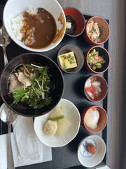 高崎 2回目の高崎駅から少し歩くけど、朝ごはんの小鉢がどれも美味(^^)うどんも大好き。
