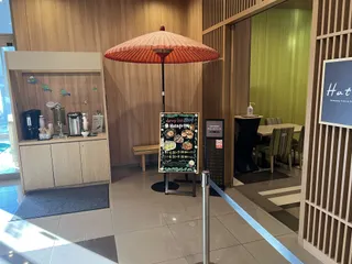 2026.1.11 ドーミーインEXPRESS掛川【お茶の街で、茶釜と城とカラカラサウナ】 フロントへ足を踏み入れると、ドーミーインEXPRESSのロゴと共に、茶釜と赤い傘が目を引く茶室の設え。0歳の息子は物珍しそうに上向いて嬉しそうな顔と声を出してました!ウェルカムドリンクにはコーヒーだ