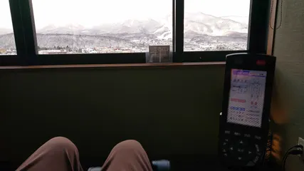 足湯に浸かりながら富士山を眺める 朝風呂で整えた後に朝食まで時間があったので屋上に上がり足湯に浸かりながら朝日にも照らされた冬景色の富士山を眺めました。こんな贅沢な時間を過ごせて最高です!ガラスが曇っていることも風景に集中出来ました。