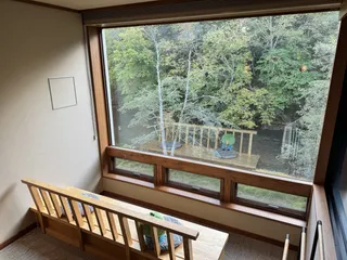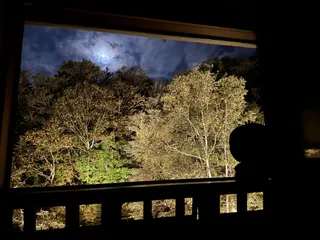 森と川のライトアップ 夜は大きな窓から森がライトアップ。部屋の電気を消すとまるで絵画のような圧倒的風景が浮かび上がります。もちろん部屋に備え付けの温泉に入りながらも素敵な景色をじっくりと堪能できます。お待ちかねの夕食は川を見れるお席でコース料理を堪能。結構腹いっぱいになりますが、それでも〆の夜鳴きそばはコーンとあおさのり